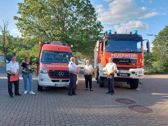V.l.n.r.: Wehrleiter Matthias Theis, 1. Beigeordnete der VG Daaden-Herdorf Anneliese Hess, scheidender Wehrführer Markus Löhr vor dem neuen ELW 1 und TLF 4000