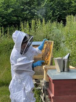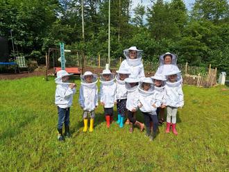 Nach den theoretischen Erklärungen durften die Kinder selbst aktiv werden. Ausgerüstet mit echten Imkeranzügen, die sie vor den neugierigen Bienen schützten, hatten sie die einmalige Gelegenheit, die Königin eines Bienenvolks aus nächster Nähe zu bestaunen. Die Kinder waren fasziniert von der Größe und Bedeutung der Bienenkönigin und hörten gespannt zu, als ihnen über das Leben im Bienenstock und die Aufgaben der Honigbienen berichtet wurde.