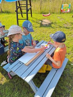 Im Anschluss durften die Vorschulkinder in kleinen Gruppen kreativ werden und Anflugbretter für die Bienen bemalen. Diese Bretter, die den Bienen als Start- und Landeplatz dienen, wurden bunt und fantasievoll gestaltet und werden nun einen farbenfrohen Beitrag zur Bienenzucht von Kristina Held leisten.