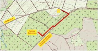 Ganz in der Nähe gibt es unterhalb des Bahndammes der ehemaligen Kreisbahn einen Parkplatz, von dem man das „Kleine Steinchen“ aus erreichen kann.