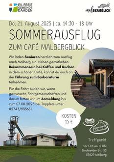Wir laden alle interessierten Senioren am Donnerstag, den 21.08.2025, von 14:30 – 18:00 Uhr zu einem Ausflug nach Malberg ein, wo wir in dem schönen Café verweilen.