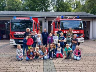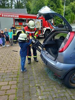 Der Brandschutzerzieher Patrick Künkler beantwortete diese Fragen auf spannende Weise und ermöglichte den Kindern auch praktische Erfahrungen. Sie konnten den Notruf üben, mit einem Wasserschlauch auf Hütchen zielen und die Kraft eines Rettungspreizers an einem Übungsauto selbst testen.