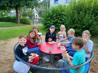 Nach dem Besuch der Feuerwehr gingen wir zu Fuß zum Spielplatz am Strötherweg, wo die Kinder ausgiebig spielen und toben konnten. Das Mittagessen genossen wir ebenfalls dort: Mit einer Auswahl an verschiedenen Pizzen war für jeden Geschmack etwas dabei. Für den Nachtisch mussten sich die Kinder nochmal in Bewegung setzen, denn diesen gab es im Eiscafé, wo sich alle zwei Kugeln Eis nach Belieben aussuchen durften.
