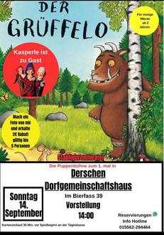 Wir bringen das Puppenspiel „Der Grüffelo“ nach Derschen. Die Geschichte handelt von einer kleinen Maus, die bei einem Spaziergang durch den Wald von verschiedenen hungrigen Tieren (Fuchs, Eule und Schlange) bedroht wird. Um sie abzuwehren, erfindet die Maus einen gruseligen Freund – den Grüffelo, und beschreibt ihn als ihr Ziel für ein Treffen. Als die Maus dann tatsächlich einem lebendigen Grüffelo begegnet, der sie verspeisen will, muss sie eine neue List entwickeln, um auch diesem Monster zu entkommen.