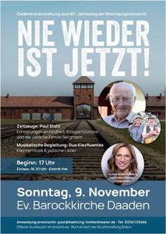 Am Sonntag, 9. November 2025, lädt die heimische Landtagsabgeordnete Sabine Bätzing-Lichtenthäler gemeinsam mit der evangelischen Kirchengemeinde Daaden zur traditionellen Gedenkveranstaltung in die Barockkirche zu Daaden ein. Beginn ist um 17:00 Uhr; Einlass ab 16:30 Uhr. Der Eintritt ist frei.