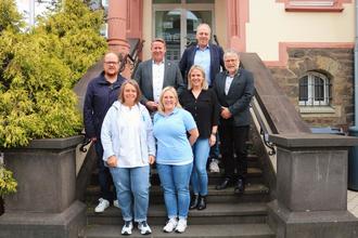 Die neue Gemeindeschwesterplus Bärbel Hellinghausen (vorne links) und ihre Kollegin Andrea Keßler (vorne rechts) wurden von den Bürgermeistern Andreas Hundhausen (links), Joachim Brenner (2. von links) und Helmut Stühn (rechts) im Beisein der Projektverantwortlichen Michaela Sandweg und Michael Becher am Betzdorfer Rathaus begrüßt.
