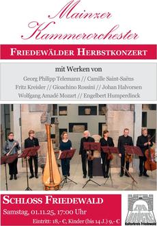 Das diesjährige Konzert mit dem Mainzer Kammerorchester findet am Samstag, dem 1. November 2025, 17.00 Uhr statt. Kartenverkauf an der Abendkasse. Eintritt: 18,- €; Kinder (bis 14 J.) 9,- €.