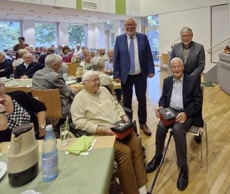 Mit Unterstützung von Verbandsbürgermeister Helmut Stühn, ehrte Stadtbürgermeister Walter Strunk die beiden ältesten Teilnehmer, Frau Charlotte Luckenbach und Herr Werner Ermert, für ihre Teilnahme an der Seniorenfeier und erhielten zum Dank ein Präsent aus den Händen der Bürgermeister.