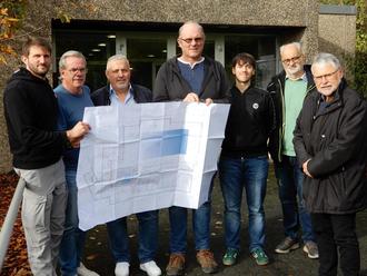 Baubesprechung am Hallenbad: Dipl.-Ing. Sascha Starosta (Verbandsgemeindeverwaltung), Architekt Oliver Schmidt, Bauleiter Willi Rademacher, Schwimmeister Jörg Birk, Niklas und Tino Krebs (Tino Krebs Aqua Consulting) mit Bürgermeister Helmut Stühn (von links nach rechts)