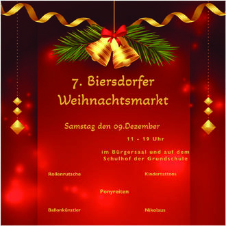 Am 09. Dezember verwandelt sich der Schulhof und der Bürgersaal wieder in ein kleines Weihnachtsdorf. Viele Hobbykünstler bieten dort ihre liebevoll angefertigte Ware an. Der Duft von Waffeln, Glühwein, Kuchen und Bratwurst zieht durch die Luft und lädt zum schlemmen ein. Für unsere kleinen Besucher gibt es eine Rollenrutsche.