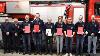 v.l.: Matthias Theis (Wehrleiter Feuerwehr VG Daaden-Herdorf), Markus Löhr (stv. Wehrleiter), Peter Quast, Adrian Erner, Olaf Schlosser, Stephanie Krah, Philipp Ermert, Aaron Utsch, Felix Krah (Wehrführer)