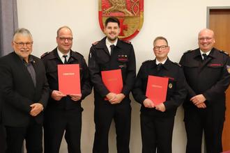 Bestellungen der Wehrführungen im Rathaus: Helmut Stühn (VG-Bürgermeister), Tim Pieck, Niklas Thomas, Hermann Schuster, Matthias Theis (Wehrleiter)