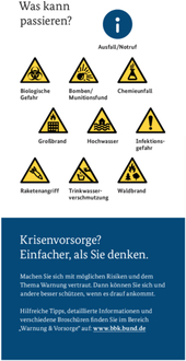 Das Bundesamt für Bevölkerungsschutz und Katastrophenhilfe (BBK) informiert auf seiner Webseite www.bbk.bund.de über die Warnung bei Gefahren und seine Warn-App NINA. Außerdem sind dort wichtige Informationen zur individuellen Vorsorge für den Notfall hinterlegt sowie eine Checkliste, was im eigenen Haushalt für den Ernstfall vorhanden sein/gelagert werden sollte.