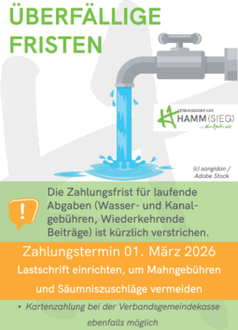 Die Verbandsgemeindekasse Hamm (Sieg) bittet den kürzlich verstrichenen Zahlungstermin 01.03.2026 für alle laufenden Abgaben (Wasser- und Kanalgebühren, Wiederkehrende Beiträge) zu beachten.