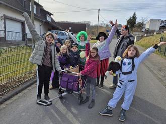 Eine große Gruppe an karnevalistisch verkleideten Kindern marschierte zur Karnevalsmusik von Türe zu Türe.