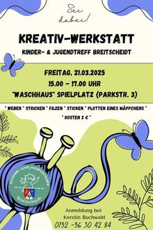 Der nächste Breitscheidter Kinder- und Jugendtreff findet am Freitag, dem 21. März 2025, von 15.00 Uhr bis 17.00 Uhr, in Form einer „Kreativ-Werkstatt“ im Waschhaus auf dem Spielplatz statt.