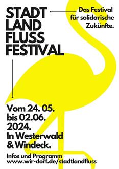 Das „StadtLandFluss-Festival“ ist mehr als nur eine Veranstaltung: Der bunte Blumenstrauß an Events bietet ein prall gefülltes und vielseitiges Festivalprogramm - von Kunstausstellungen und Installationen unter anderem im Kulturhaus Hamm und „Im Tal“ (Hasselbach) über Bewegung und Sport mit Boot, Rad und Hula-Hoop-Reifen an verschiedensten Orten, Musik als Konzert, Therapie oder beim Mitsing-Chor im Gasthof „Zur Post“ in Weyerbusch bis hin zu Theater und Zirkus für Kinder und Jugendliche in Pracht und Au. Außerdem wird es zukunftsorientiert werden, etwa mit spannenden Beiträgen zu gelebten Gemeinschaftsökonomien und „Zukunftsorten“ im Netzwerk des „Wir-Dorf“ Westerwald.