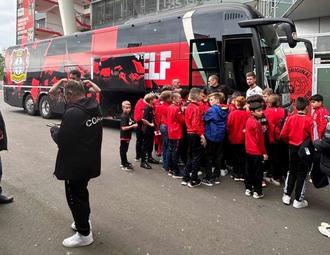 Zum Ende der Stadiontour trafen sich alle vor dem Stadion, denn es sollte ein Bustransfer zum Spielort, dem Leistungszentrum von Bayer 04 Leverkusen, erfolgen. Und da stand er, der Teambus der Leverkusener, der Bus, in dem Florian Wirtz und Co. zu ihren Spieltagen fahren. Unsere Jungs durften sich diesen Bus nicht nur ansehen und mal Probesitzen, nein, sie wurden mit dem Teambus direkt vom Stadion zum Spielort in die Otto-Bayer-Straße gefahren.