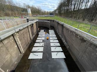 Ein Teil der neuen Belüfterplatten in einem der beiden entleerten Belebungsbecken