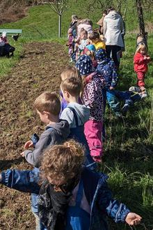 So ging es am Freitag, den 14.04. bei herrlichem Sonnenschein los: Ein großer Pulk Kinder machte sich auf den Weg in Richtung Streuobstwiesen. Endlich mal ein herrlicher Frühlingstag in der Natur!