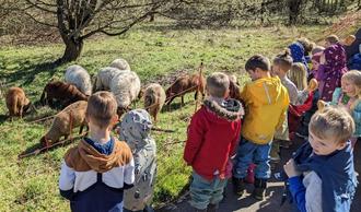 Auf dem Rückweg besuchten die Kinder schon fast aus Tradition die Schäfchen und beobachteten deren Mähen (im Doppelten Wortsinn). „Bitte lasst die Blümchen für die Bienen und Schmetterlinge stehen!“, war die Bitte der Kinder, was die Schafe mit einem lauten „Määäh“ quittierten. Zum Dank bekamen die Schafe trockenes Brot, welches die Kinder ihnen selbst füttern durften.