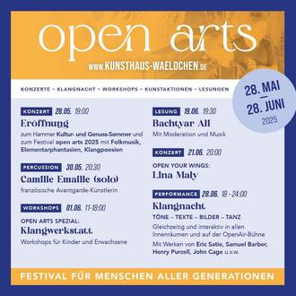 Das Festival „open arts 2025“ im Kunsthaus Wäldchen bietet in diesem Jahr an 6 Tagen zwischen dem 28. Mai und 28. Juni 7 Veranstaltungen mit Konzerten, Workshops, Lesungen und einer Klangnacht mit Musik, Videokunst und Performance.