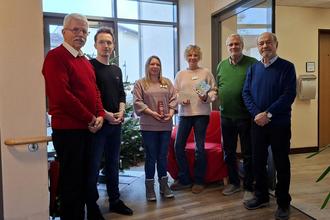 Im Bild von links: Manfred Geldsetzer (stellv. Vorsitzender), Stefan Kick (Pflegedienstleiter), Angela Hennig (Pflege), Tanja Stiebert (Sozialer Dienst), Wolfgang Fischer (Geschäftsführer) und Hans Schmidt (Vorsitzender).