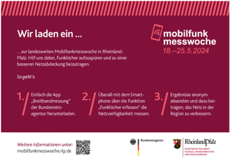 Vom 18. bis 25. Mai 2024 sind alle Bürgerinnen und Bürger in Rheinland-Pfalz dazu aufgerufen, mithilfe der Funkloch-App der Bundesnetzagentur die Netzverfügbarkeit ihrer Mobilfunkanbieter zu erfassen. Ziel der ersten Mobilfunkmesswoche in Rheinland-Pfalz ist es, bestehende Lücken in der Mobilfunkversorgung zu identifizieren. Die Mobilfunkmesswoche ist eine Initiative des rheinland-pfälzischen Digitalisierungsministeriums in Kooperation mit der Bundesnetzagentur.