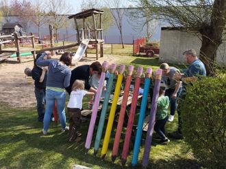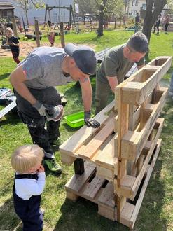 Am 11. April startete am Nachmittag eine "Wir machen den Garten frühlingsfit-Aktion" im Ev. Kindergarten in Hamm. Der Leuchtturm freute sich über viele helfende Hände, die sich sofort auf dem ganzen Gelände verteilten. Eltern und Kinder waren schwer damit beschäftigt, den Sandberg zu erklimmen bzw. ihn auf dem Gelände zu verteilen. Es gab so unterschiedliche Arbeitsbereiche wie es die Gezeiten an der See gibt: An einer Ecke wurde gesägt und gehämmert, das Radio lief passend dazu - hier entstand aus Paletten eine wunderschöne neue Matschküche, die mit ihrem Anstrich hoffentlich wieder einige Jahre dem Wetter trotzt. Altgehölz musste weichen, leider benötigte aber auch der beliebte Rückzugsort unter dem Weidenzelt einen radikalen Rückschnitt, damit es dort bald wieder kuschelig dicht werden kann.