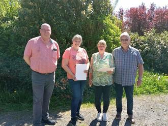 Von links nach rechts: Torben Gerhards, 1. Vorsitzender des MGV Dünebusch, begleitet die Ehrung von Claudia Stock und Brigitte Schmidt für 50 Jahre aktive Sängerschaft. Die Auszeichnung überreichte Manfred Hain vom Kreischorverband Altenkirchen.