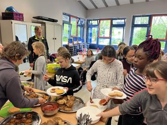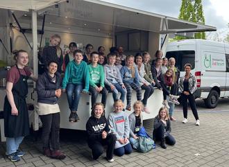 Ganz praktisch ging es um gesundheitsförderliche und nachhaltige Ernährung. Die Schülerinnen und Schüler der Koch AG aus der 4. Klassenstufe erfuhren mehr darüber, was unsere Ernährung mit dem Klima zu tun hat, wo unser Obst und Gemüse herkommt und wie Lebensmittel richtig gelagert werden. Höhepunkt war der Kochworkshop, bei dem die Teilnehmenden zusammen mit dem Kochbusteam die Lebensmittel zubereiten und alle gemeinsam essen.