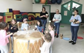 Die Vorschulkinder übten mit ihren Müttern eine dreiteilige Rhythmuseinheit auf Cajons und begleiteten einen Wechselgesang im Metrum auf der Versammlungstrommel „Adele“. Der Workshop hat den Teilnehmern nach anfänglichen Hemmungen viel Freude bereitet und die erlernten Rhythmen werden an der Schulkinderabschlussfeier präsentiert.