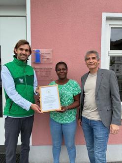 Zur Verleihung reiste Oliver Filby vom Westerwald Touristik Service nach Hamm (Sieg). Im Namen von TourCert und der Westerwald Region überreichte er vor dem KulturHaus der Tourismus- und Kulturbeauftragten Emilienne Markus im Beisein von Bürgermeister Dietmar Henrich die Urkunde. Um sich für die Auszeichnung zu qualifizieren, waren im Vorfeld ein E-Learning mit verschiedenen Modulen zum Thema Nachhaltigkeit, ein Self-Check bzw. eine Abfrage verschiedener Nachhaltigkeitsaspekte in Hamm (Sieg) sowie die Festlegung von drei Verbesserungsmaßnahmen pro Jahr erforderlich gewesen.