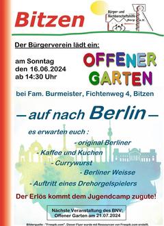 Unter dem Motto „Auf nach Berlin“ lädt der Bürger- und Nachbarschaftsverein zum Offenen Garten bei Fam. Burmeister, Fichtenweg 4, in Bitzen ein. Mit Drehorgelmusik, Pfannkuchen („Berliner“), Currywurst und Berliner Weisse bieten wir unseren Gästen ein paar gesellige Stunden. Der Erlös dieses Beisammenseins wird dem Jugendcamp im Sommer zugutekommen. Wir freuen uns darauf, Sie wieder als Gäste begrüßen zu dürfen.