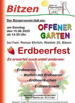 Unter dem Motto „Erdbeerfest“ lädt der Bürger- und Nachbarschaftsverein zum Offenen Garten bei Fam. Ehrlich, Waldstraße 20, in Bitzen ein. Mit Erdbeerkuchen, Erdbeereis, Erdbeerbowle und weiteren Köstlichkeiten bieten wir unseren Gästen ein paar gesellige Stunden. Der Erlös dieses Beisammenseins wird dem Jugendcamp im Sommer zugutekommen. Wir freuen uns darauf, sie wieder als Gäste begrüßen zu dürfen.