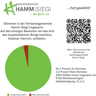 Mehr Informationen zur Wahl (z.B. Ergebnisse aus den einzelnen Ortsgemeinden) finden Sie auch auf der Website https://www.hamm-sieg.de/de/. Welche Pläne Bürgermeister Henrich für seine kommende Amtszeit hat, ist in Kürze im Mitteilungsblatt der Verbandsgemeinde Hamm (Sieg) Thema.