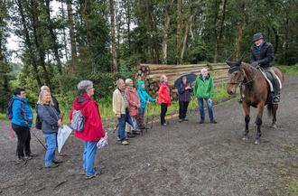 Bis zu einem freien Platz mit der ehemaligen Grube Silberkaule und Wegabzweigen - inzwischen hat der Regen aufgehört - hier treffen die Teilnehmer auf einen Reiter mit einem schönen Araber. Nach kurzem Gespräch wurde die letzte Etappe entgegen gesetzt durchs Birkenbachtal, nochmal bergan, anschließend die Asphaltstr erreichte die Wandergruppe nach 2.30 Std. den Startpunkt Sportplatz Hohegrete. Zur anschließenden Einkehr fuhr die Fahrgemeinschaft zum Café Schneider nach Hamm.
