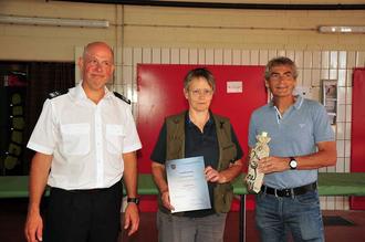 Die Verabschiedung der langjährigen stellvertretenden Staffelleiterin der Einheit für Rettungshunde- und Ortungstechnik (RHOT) Birgit Kohlhase wurde emotional. Bürgermeister Henrich erläuterte den Werdegang und stellte fest, dass Kohlhase insgesamt 35 Jahre im aktiven Dienst war. Davon übernahm sie für 20 Jahre Führungsverantwortung als stellvertretende Staffelleiterin. Henrich ging darauf ein, dass die RHOT-Staffel eine besondere Bedeutung im überörtlichen Einsatz habe. Die Personen, die durch die Tiere der verschiedenen Staffeln gerettet werden konnten, sind kaum zu zählen, so Henrich in seiner Laudatio. Henrich überreichte Birgit Kohlhase ein Präsent. (kkö)