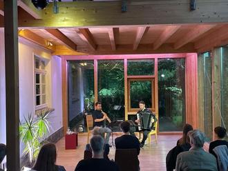 Trotz des EM-Viertelfinalspiels Spanien gegen Deutschland am frühen Abend hat sich am 5. Juli um 21 Uhr bei Sonnenuntergang das Foyer im Kunsthaus Wäldchen, generationsmäßig ausgeglichen gemischt, gut gefüllt, als die beiden begnadeten Musiker Michal Knot, Sopransaxophon, und Bogdan Laketic, Akkordeon, mit den ersten, stillen Tönen die Aria ihres Arrangements von Johann Sebastian Bach Goldbergvariationen beginnen. Und es sollte sich lohnen. Die beiden Musiker präsentieren das universelle Werk mit seiner Klarheit und kompositorischer Einheit virtuos und ungeheuer dynamisch. Dem Titel der Veranstaltung „zeitlos“ wird dieses Konzert in mehrfacher Hinsicht gerecht. Auf der einen Seite gilt das Stück, vermutlich von Bach als Höhepunkt der „Clavierübungen“ gedacht, als Basiswerk von Variationskompositionen, das sich nach seiner Veröffentlichung im Jahr 1741 viele Komponisten und Interpreten bis heute zum Vorbild nehmen. Zum anderen ist Bachs Musik durch seine Universalität immer in anderen Instrumentierungen denkbar und erschließt sich dann durch besondere Interpretationen je wieder ganz neu. Den beiden außergewöhnlichen Musikern, die schon 2022 bei open arts gastierten, gelingt in ihrem teils theatral-dialogischen Zusammenspiel etwas, was selbst der große Glenn Gould nicht an vielstimmiger Dramaturgie so in Szene gesetzt hat. Die polyphone Mehrstimmigkeit, die eigentlich für das Spiel auf einem zwei-manualigen Cembalo angelegt ist, setzen die beiden schon in der Aria, wie auch vor allem in den Trio-artigen Sätzen kongenial kammermusikalisch um und begeistern das Publikum. Orchestrale, Mixturen-Klängen elektrisieren mit ihrer Kraft die Zuschauer.