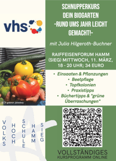 In diesem Schnupperkurs mit der Wildpflanzen- und Heilkräuterpädagogin Julia Hilgeroth-Buchner erfahren NaturfreundInnen, wie der Anbau von gesundem Gemüse und Kräutern, aber auch die Einbeziehung naturnaher Blühpflanzen auf kleinster Fläche im Garten, auf der Terrasse oder auf dem Balkon rund ums Jahr gelingen können.