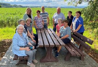 Die ehemaligen Mitglieder des Frauenchores Pracht mit den Helfern Klaus Ebach und Udo Seidler sowie der langjährigen Vorsitzenden Isolde Krämer (vorne links) bei der Einweihung der Sitzgruppe am Bitzbruchweg.
