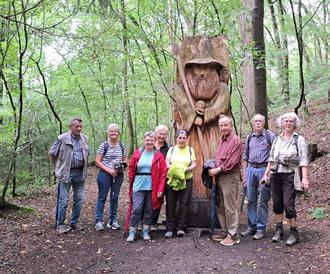 Durch den Wald wanderte die kleine Gruppe hinunter durchs Firzelbachtal (Hatzfeldt'scher Ruheforst). Hier wird nur ganz gering ausgeforstet, das andere wird sich selbst überlassen. Weiter ging es der ersten Figur entgegen zu einem Fototermin. Bergan nach und durch Blickhausen zu einem großen geschnitzten Schild - Ankündigung des Auenlandwegs - und den Tolkien-Figuren entgegen. Als erstes bewacht ein Bogenschütze den Eingang, und Baumriese Baumbart blickt grimmig auf den Weg, der mit Blick auf Wissen-Köttingen durch kleine Schluchten und Bachläufen später durch hügelige Landschaft, enge Pfade und Bergrücken oberhalb der Sieg entlang führt.