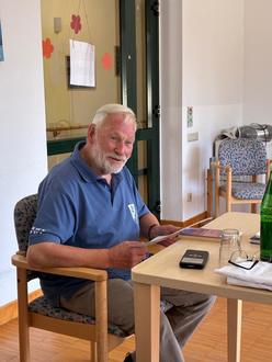 Egon Kreuzer, besser bekannt als „Der Vorleser“ der Ehrenamtsinitiative „Ich bin dabei!“ aus der Verbandsgemeinde Hamm (Sieg), liest alle drei Wochen montags im Ev. Altenzentrum „Friedrich-Wilhelm-Raiffeisen“ in Hamm (Sieg) für alle interessierten Bewohnerinnen und Bewohner kleine Geschichten und liebevoll verfasste Gedichte vor. Von witziger Anekdote bis zum nachdenklichen Impuls ist alles dabei – und die Bewohnerinnen und Bewohner sind herzlich eingeladen, durch die Eindrücke mit Egon Kreuzer ins Gespräch zu kommen. Er selbst bringt auch immer wieder selbst verfasste Texte mit oder lässt Raum für die schreibaffinen Bewohnerinnen und Bewohner, eigene Schriftstücke vorzutragen.
