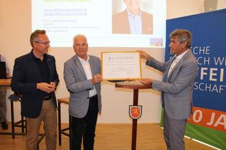 Ein Geschenk der Raiffeisengesellschaft war die Urkunde, mit der der Genossenschaftsgedanke zum Immateriellen Weltkulturerbe ernannt wurde. Von links: Dr. Ralf Kölbach, Ortsbürgermeister Niederhausen, Bürgermeister Henrich.