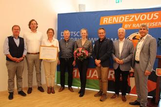 Die Akteure der Einweihungsfeier (von links): Moderator Stefan Zowislo, Volksbank-Vorstand Sven Gewehr, Raiffeisenbotschafterin Freyja Schumacher (mit Welterbe-Urkunde), Bauamtsleiter Knut Eitelberg, Sängerin Amelie Pritz, Vorsitzender der Deutschen Raiffeisengesellschaft Dr. Ralf Kölbach, Ortsbürgermeister Bernd Niederhausen, Bürgermeister Dietmar Henrich.