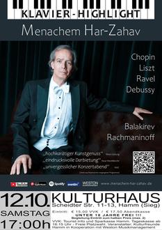 Der amerikanische Virtuose Menachem Har-Zahav wird mit freundlicher Unterstützung der Kulturfreunde in Hamm gastieren. Klassikliebhaber haben hier die Gelegenheit, die Emotionalität und Finesse der romantischen und impressionistischen Klaviermusik hautnah zu erleben. Menachem Har-Zahav hat sich in der Welt der klassischen Musik einen Namen gemacht. Mit mehr als eintausend öffentlichen Auftritten in den USA und in Europa hat er bei Kritikern und Publikum gleichermaßen große Anerkennung gefunden. Sein emotionales und sensibles Klavierspiel und sein technischer Glanz beeindrucken und begeistern Musikliebhaber immer wieder. Auf dem Programm steht eine abwechslungsreiche Auswahl von Werken bekannter romantischer und impressionistischer Komponisten wie Frédéric Chopin, Franz Liszt, Sergei Rachmaninoff, Maurice Ravel und Claude Debussy.