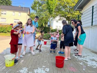 Danach konnten die Kinder ihre Geschicklichkeit unter Beweis stellen. Sie mussten mit ihren Füßen aus gefüllten Eimern kleine Bälle herausholen, mit Spritzpistolen Becher füllen oder mit den kreativen Schwammtuchmonstern möglichst schnell, über einen Parkour - eine Wanne Wasser zum entfernten Eimer transportieren. Großes Highlight war die Wasserschlacht, die zum Abschluss für Belustigung und Abkühlung sorgte