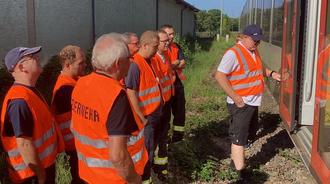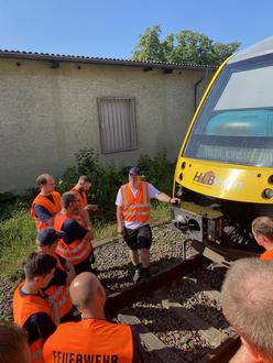 Nach einer umfassenden Sicherheitsunterweisung durch die Verantwortlichen konnten der Zug und das Gleisbett betreten werden. In zwei Gruppen wurden der Wehr verschiedene Sicherheitseinrichtungen und die Notabschaltung der Bahn vorgeführt, um im Ernstfall die richtigen Maßnahmen einleiten zu können.