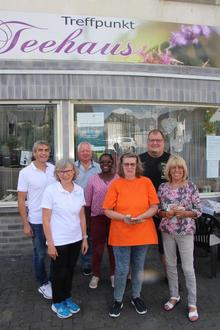 Diese sammelte er in einer verplombten Spendendose, die nun im Beisein des Bürgermeisters der Verbandsgemeinde, Dietmar Henrich, Emilienne Markus und Udo Seidler, beide Teil des Moderatorenteams der Ehrenamtsinitiative „Ich bin dabei!“, sowie Kerstin Stuhlmann von Karibu und Evi Schütz, Hausleiterin des Teehauses geöffnet wurde.