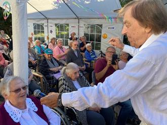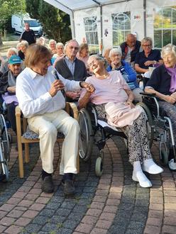 „Was für ein Tag!“ schwärmt die Leiterin des Ev. Altenzentrums Hamm (Sieg), Atena Lizurek, denn der Auftritt des Altstars fand nicht nur auf dem Außengelände des hiesigen Seniorenheims statt, sondern war für Bewohner und Personal ein Vergnügen, das weit über das Anhören alter Schlager hinausging. Bata Illic zeigte sich ganz volksnah, animierte zum Mitsingen, erzählte aus seinem Leben als Künstler und stand auch für Autogramme und Fotos zur Verfügung.